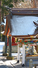 (hinoki - Japanese Cypress) surrounding the shrine itself must be hundreds of years old, reminiscent of the beautiful cedars at Ise-jingu. The gate and its surroundings were donated in 1845 by a religious fraternity in Fukagawa, Edo and rafted up the Arakawa River. In February, a special bean-throwing ceremony is held. On the 19th of every month, red bean rice is offered to the holy-dog (maybe a wolf, according to legend) who guards the shrine. The name of the area Mitsumine means 'three peaks' and refers to Mt. Myōhō, Mt. Shiraiwa and Mt. Kumotori: a connecting route between them was a travelling course for ascetic monks. The innermost